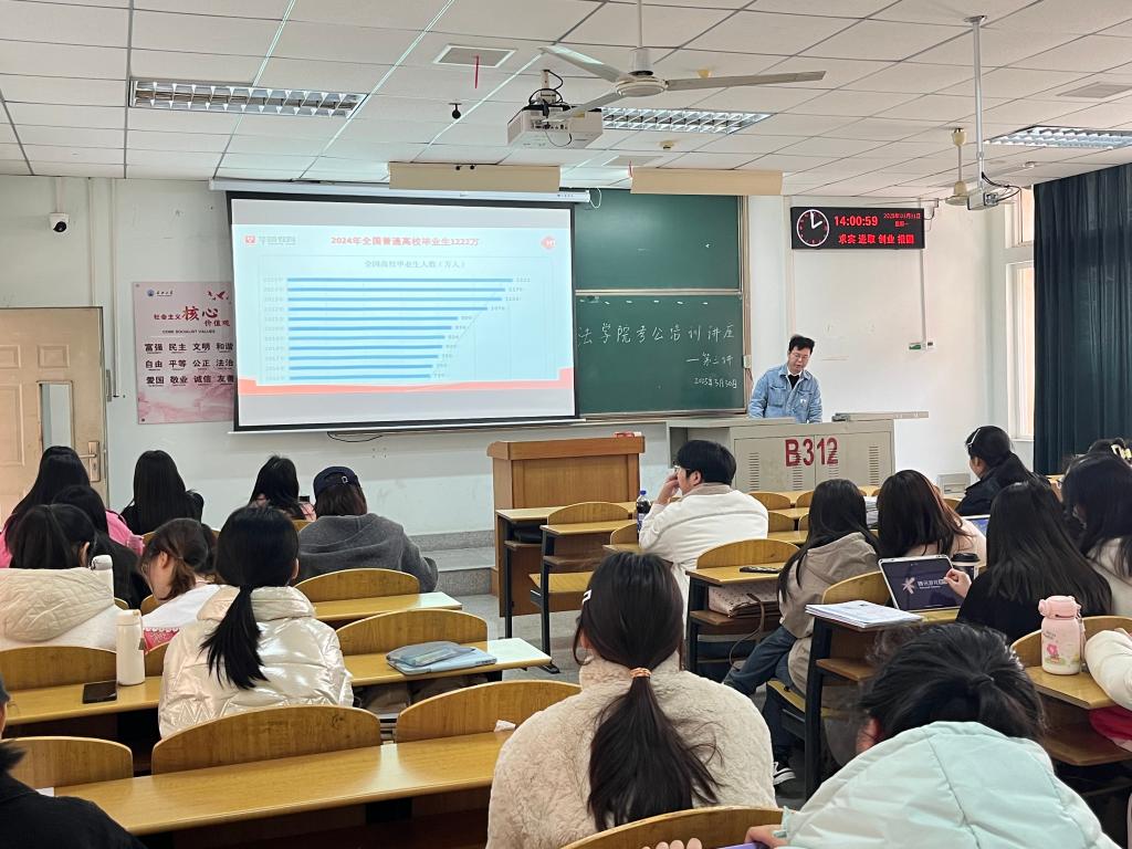 (通讯员 胡曦禾)2025年3月31日,法学院公务员考试培训讲座第三讲在13教B312举行,讲座由专业公考培训机构华图教育章康老师主讲,法学院部分22级本科生参加。
